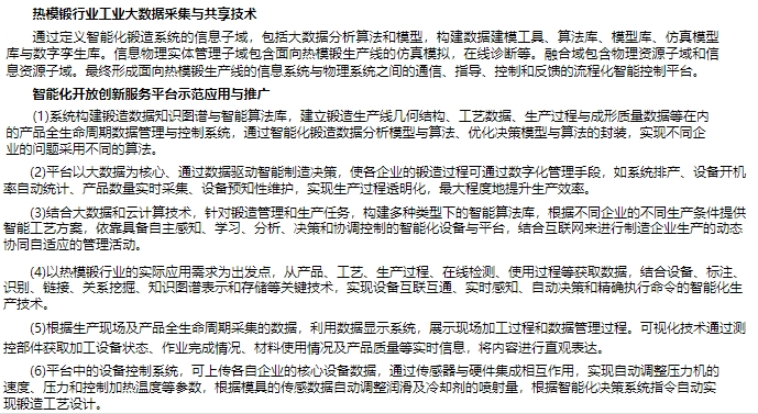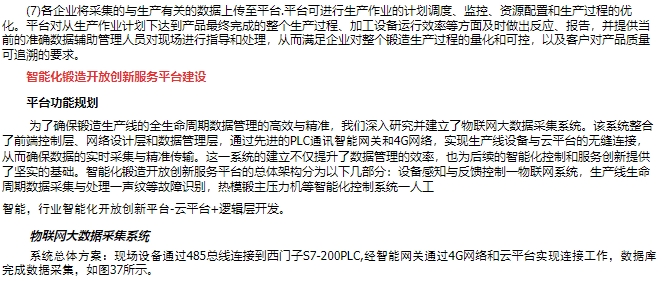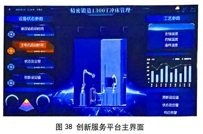 以智能化鍛造生產(chǎn)閉環(huán)線為核心,基于鍛件的工藝、生產(chǎn)過程、在線監(jiān)測數(shù)據(jù)、銷售數(shù)據(jù)和使用過程等,與人工智能生產(chǎn)技術(shù)相融合,開發(fā)一套智能化鍛造服務平臺。平臺具有鍛件產(chǎn)品質(zhì)量監(jiān)督、智能工藝設計、自動控制調(diào)節(jié)設備參數(shù)、自動調(diào)節(jié)生產(chǎn)頻率等功能。通過圖36所示熱模鍛數(shù)據(jù)服務創(chuàng)新服務平臺顯示系統(tǒng)呈現(xiàn),實現(xiàn)狀態(tài)感知、實時分析、精準執(zhí)行及自主決策。