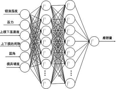 本神經(jīng)網(wǎng)絡模型采用擁有兩個隱藏層的四層神經(jīng)網(wǎng)絡結(jié)構(gòu),如圖31所示,輸入層有6個神經(jīng)元,即為對熱模鍛過程中模具的磨損量造成影響的參數(shù)(鍛造的溫度。壓力,圓角半徑、上模下壓的速度、模具的硬度和上下模的間隙)。隱藏層1和2都采用1個神經(jīng)元,輸出層即為模具的磨損量。輸入層和隱藏層的函數(shù)連接采用logsig,隱藏層和輸出層的函數(shù)采用tansig。