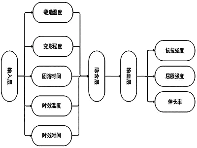 構(gòu)建的神經(jīng)網(wǎng)絡模型采用三層結(jié)構(gòu),即輸入層、隱含層和輸出層。模型結(jié)構(gòu)如圖33所示,輸入層的參數(shù)分別是鍛造溫度、變形程度、固溶時間、時效溫度、時效時間,輸出層的參數(shù)為抗拉強度、屈服強度、伸長率。