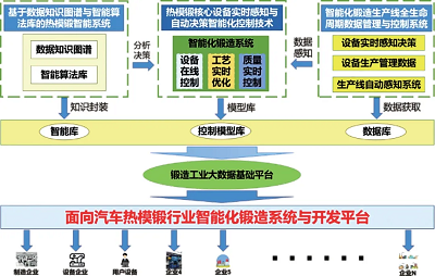 本項目構(gòu)建鍛造系統(tǒng)數(shù)據(jù)知識圖譜與智能算法庫,形成汽車典型零件熱模鍛智能庫,研究熱模鍛核心設備實時感知與自動決策智能化控制技術(shù),建立鍛造生產(chǎn)線鍛件幾何結(jié)構(gòu)、工藝數(shù)據(jù)、生產(chǎn)過程與成形質(zhì)量數(shù)據(jù)等在內(nèi)的產(chǎn)品全生命周期數(shù)據(jù)管理與控制系統(tǒng),開發(fā)一套面向汽車行業(yè)熱模鍛智能化鍛造系統(tǒng),實現(xiàn)智能化鍛造大數(shù)據(jù)分析模型與算法、優(yōu)化決策模型與算法的封裝,形成智能熱模鍛工業(yè)大數(shù)據(jù)綜合技術(shù)服務平臺,為不少于50家浙江省汽車零配件熱模鍛中小企業(yè)開放服務,本項目的整體研究內(nèi)容與路線架構(gòu)圖如圖34所示。