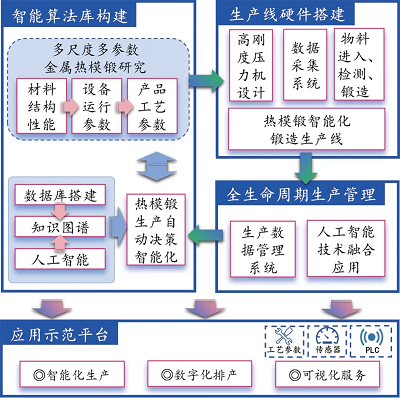 總體上看,國外智能化設備及系統比國內先進, 國內雖然在智能化設備上取得了一定的進步,但在智能化系統上還尚未建立完整的、大型的數據庫,軟件開發也處于起步階段,與國外差距較大。順應上述需求,需要面向特定鍛造領域針對其中的智能化生產系統與服務平臺中的關鍵問題開展相關研究。本項目目 標是搭建面向汽車熱模鍛行業的智能化鍛造系統與開放創新服務平臺,并進行應用示范,智能化鍛造系統總體架構如圖1所示。