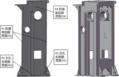 借助機身殼模型的拓撲優化概念構型,以及機身結構的應力分布,我們將機身還原為三維實體模型進行如圖4所示的結構改造,在機身方孔和曲軸支撐孔兩側材料分布最為密集之處依照最優拓撲構型設置寬度為P2和P3的支撐筋:在機身設計區域兩側和方孔上端設置寬度為P1的支撐筋,設計域前后側面設置板厚為P4。對比優化后在Abaqus軟件中獲得的壓力機機身最大相對位移量與粒子群優化得到的目標函數值可知,兩者相差0.58%.幾乎沒有多少差距,證明響應面結合粒子群優化獲得的設計變量參數數值是可靠的。