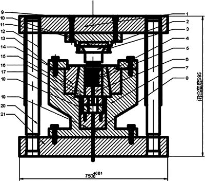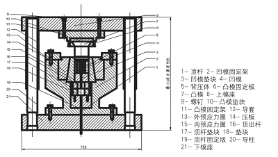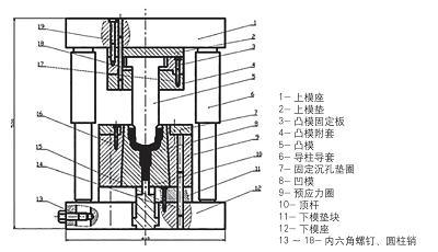 鐘形罩擠壓成形需要四套模具,各擠壓步驟模具結構除凸凹模外基本相同。反擠壓是保證零件的尺寸精度和表面粗糙度的關鍵,擠壓時模具要承受一定的高壓,所以對反擠壓模具要求較高,設計圖如圖14所示。