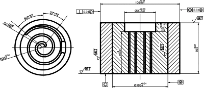 模膛尺寸計算。凹模型腔尺寸D=D公稱+D公稱α坯t坯-D公稱α模t模-△D彈=110mm,凸模直徑d=d公稱+d公稱α坯t坯-d公稱α模t模+△d彈=103mm。