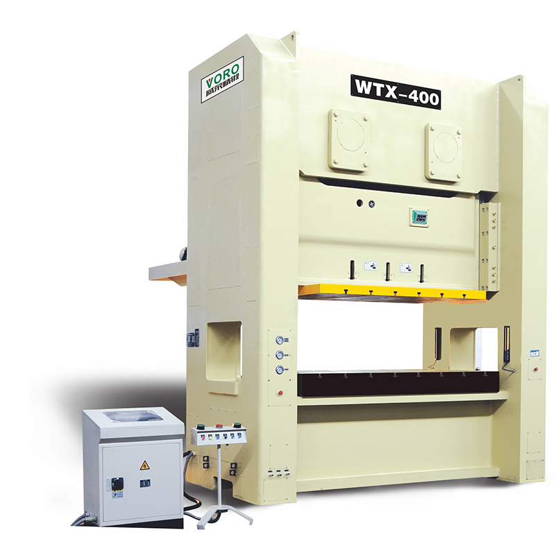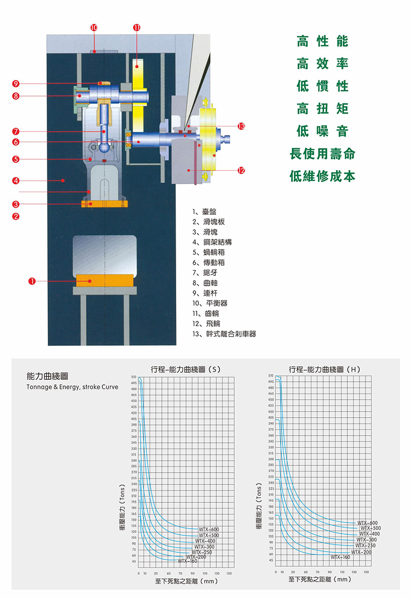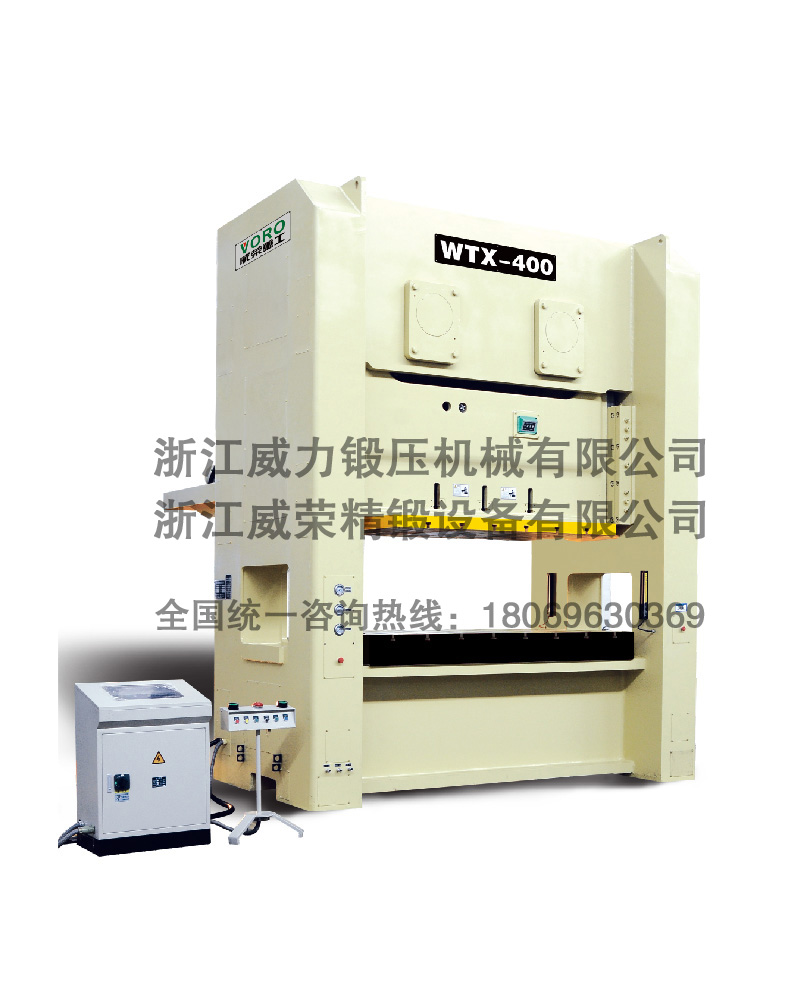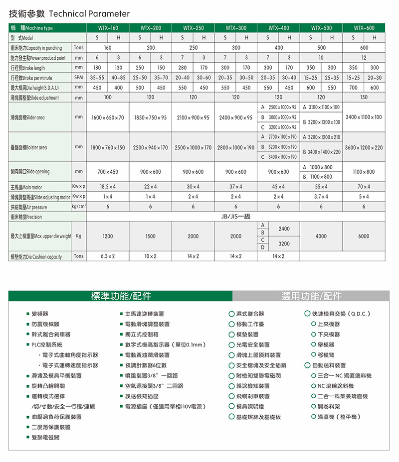 WTX系列沖床機身具有極高之剛性、良好之精度及較大之床面,可適用連續加工順送之下料、沖孔、成形、引伸等加工,并可選擇性加裝移動臺車,以達快速換模之目的。此種機型特別適用于汽車、摩托車、五金、家電等制品之沖壓加工。